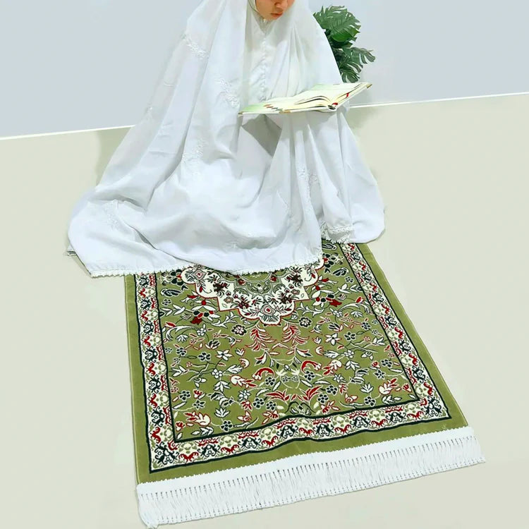 The prayer mat is made frompremium velvet, offering both elegance and a soft, luxurious feel.