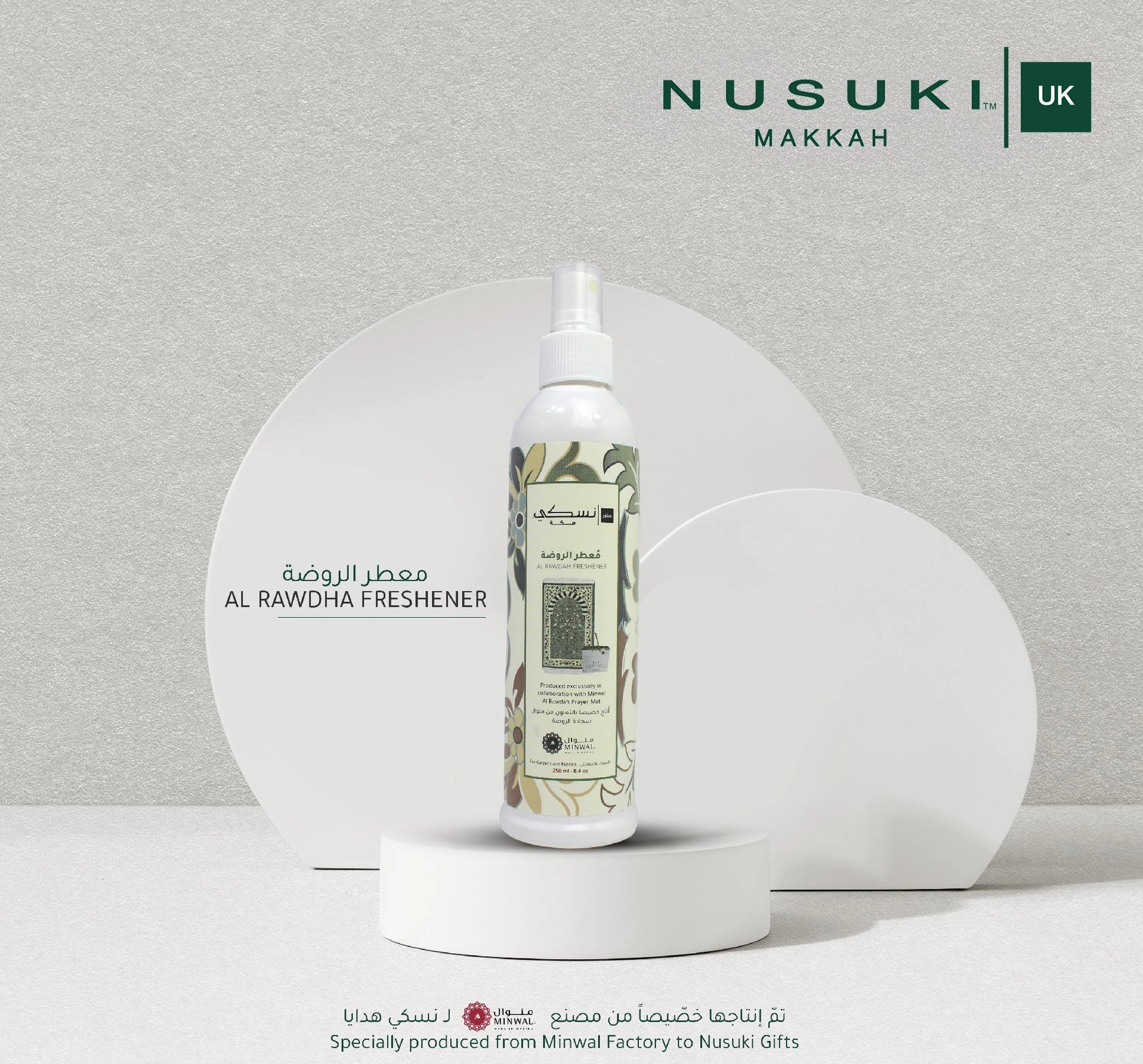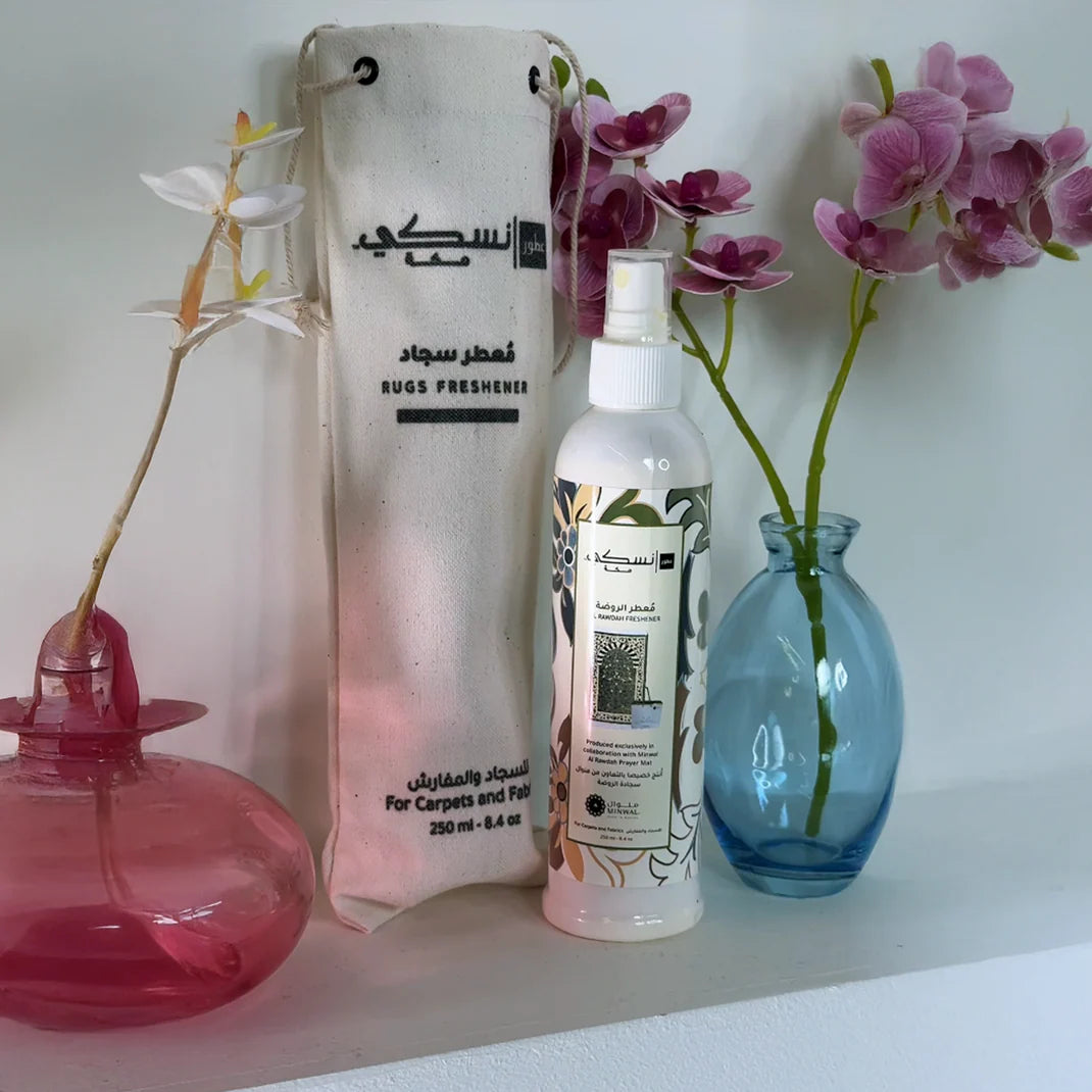 Nusuki’s Al-Rawdah Freshener offers a unique spiritual aroma, inspired by the sanctity of Al-Rawdah. With its long-lasting fragrance and high stability, it refreshes carpets, fabrics, and living spaces, creating a truly uplifting atmosphere.