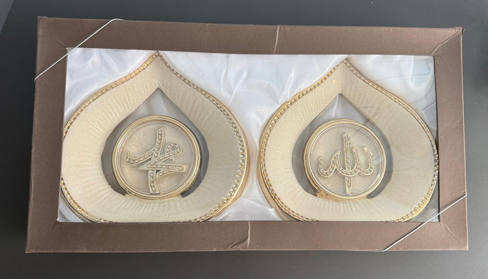 Set includes two ornaments – Allah (الله) and Muhammad (ﷺ) calligraphy