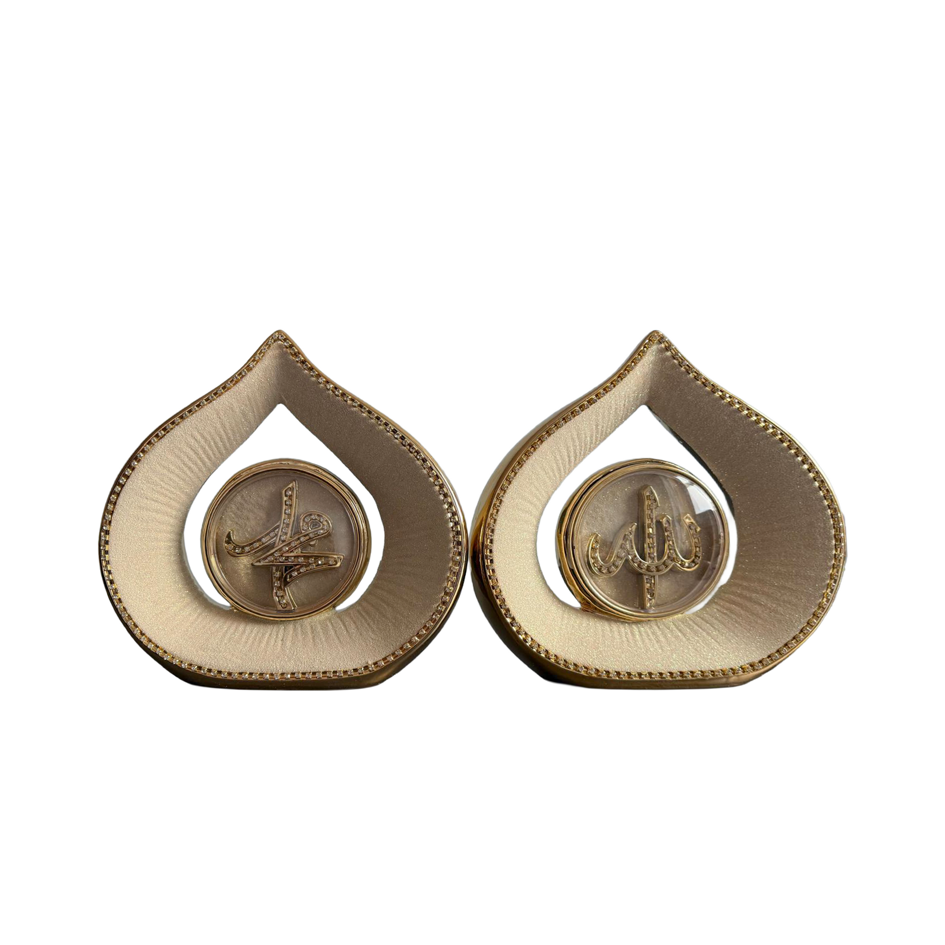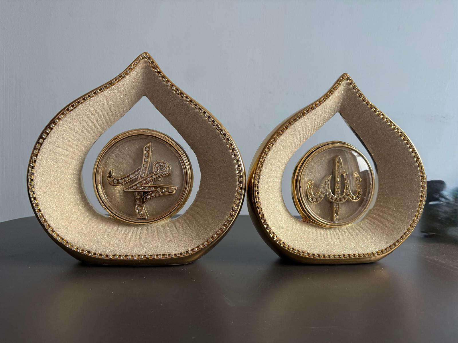 Add a touch of divine elegance to your home with this beautifully crafted Allah and Muhammad Ornament Set. Featuring intricate Arabic calligraphy encased in a teardrop-shaped frame with shimmering gold accents and crystal embellishments, this set symbolizes faith, beauty, and devotion.